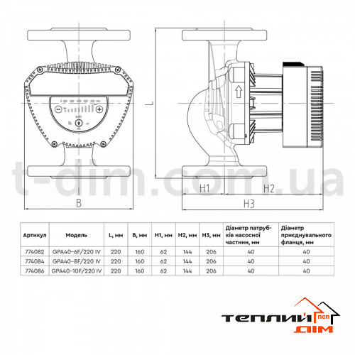 Насос циркуляційний енергозберігаючий фланц 8-130Вт Hmax 8м Qmax 133л/хв DN40 220мм + зворотний флан AQUATICA GPA40-8F/220 IV (774084)