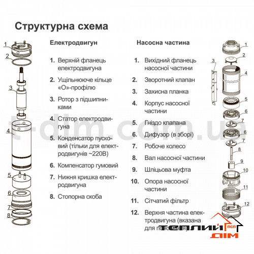 Насоси даної серії призначені для перекачування чистої води і можуть застосовуватися: для побутового використання при водопостачанні з свердловин і резервуарів (обов'язкова установка кожуха охолодження), для перекачування води в резервуари, для зрошувальних систем, для автоматичної подачі води спільно з невеликими резервуарами при використанні керуючої автоматики (керуючі реле, контролери тиску). Електродвигун насоса приєднується кабелем: Марки H07RN-F (аналог КГ-ХЛ) Жили з мідного дроту, оболонка - поліетилентерефталатна плівка і ізоляційна гума Гнучкість - багатодротяні струмопровідні жили в поєднанні з невеликим кроком скручування Температура навколишнього повітря від -25°C до +60°C Ізоляція кабелю при короткому замиканні, тривалістю не більше 5 сек., витримує температуру +200°C Переріз розраховується і відповідає потужності електродвигуна Підібрати кабель можна за посиланням >>> Насосна частина: Корпус насосної частини: нержавіюча сталь AISI 304 Вихідний фланець: латунь Вал насосної частини: нержавіюча сталь AISI 304 Муфта вала: нержавіюча сталь AISI 304 Робоче колесо: технополімер Шайба фасонная розділова: технополимер Дифузор: технополимер Електродвигун: Тип двигуна: асинхронний, маслонаповнений, з вбудованою в обмотку термозахистом Обмотка статора: мідь Корпус електродвигуна: нержавіюча сталь AISI 304 Вал двигуна: нержавіюча сталь Механічне ущільнення: кераміка/графіт Підшипник: кочення (C&U) Напруга: U 1 ~ 230 ± 10% В Частота: 50 Гц Клас ізоляції: F Клас захисту: IP68 Кабель: 3 × 1.5 мм² × 2.8 м (кількість жил × перетин × довжина) Умови застосування: Максимальна температура рідини: + 35ºС Глибина занурення під дзеркало води: до 60 м Діаметр свердловини: від 93 до 110 мм Зміст абразівосодержащіх домішок в підвішеному стані (піску, глини, вапна і т.д.): не більше 0.25% Водневий показник води (рН): 6.5-8.5 Загальна мінералізація води: не більше 1500 г/м³ Термін гарантійного обслуговування: 24 місяці Особливості: Укомплектований Ремкомплектом для подовження кабелю (профі) AQUATICA (779581) Як правильно використовувати ремкомплект для подовження кабелю після 2015 року описано тут Основні дані Торгова марка Dongyin Гарантія, міс 24 Технічні дані Тип відцентрові Потужність, Вт 1500 Максимальний напір, м 197 Максимальна продуктивність, л/хв 45 Діаметр свердловини, мм від 93 до 110 Кількість фаз Однофазний Напруга U 1 ~ 230 ± 10% В Номінальна сила струму, I (А) 9.7 Частота, Гц 50 Потужність двигуна приводу, к.с. 2.0 Вал двигуна Нержавіюча сталь Робоче колесо Технополимер Тип двигуна Асинхронний, маслонаповнений, з вбудованим в обмотку термозахистом Обмотка статора двигуна Мідь Механічне ущільнення Кераміка/графіт Клас ізоляції F Клас захисту IP68 Довжина кабелю, м 2.8 Перекачувана рідина Зміст абразівосодержащіх домішок (піску, глини, вапна і т.д.): не більше 0.25% Діаметр напірного патрубка DN2, "(дюйм) 1 Матеріал корпусу Нержавіюча сталь AISI 304 Діаметр, мм 80 Максимальна глибина занурення під дзеркало води, м до 60 Максимальна температура перекачуваної рідини, °C 35 Мінімальний діаметр свердловини, мм 93 Максимальний діаметр свердловини, мм 110 Діаметр твердих частинок в підвішеному стані, мм 0.2 Габаритні розміри Довжина, мм 1823 Маса брутто, кг 17.0 Упаковка товара Довжина упаковки, мм 1900 Ширина упаковки, мм 95 Висота упаковки, мм 130